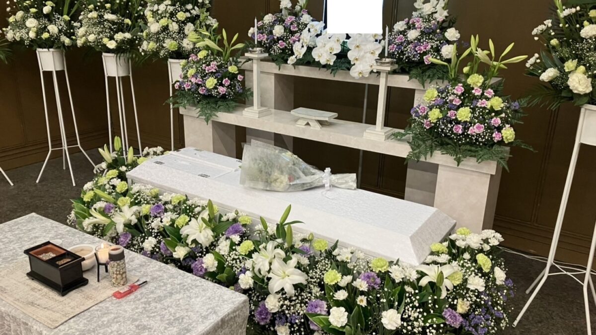 大阪市立北斎場中1式場での一日葬は朝9時より式場内へ飾付けを行い祭壇、供花などを飾付けを行い10時頃に遺族様に式場へお越し頂きました。